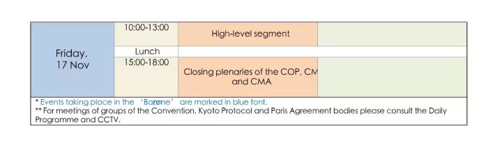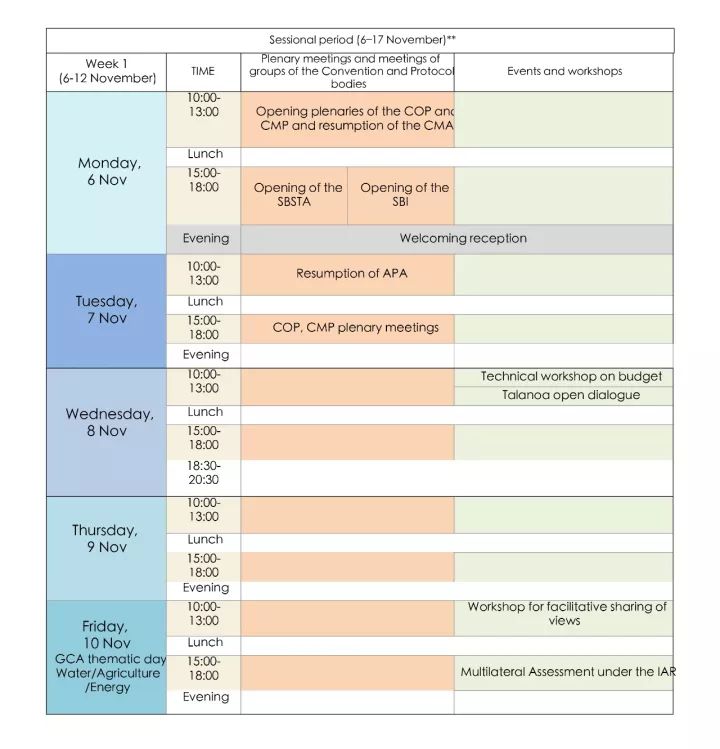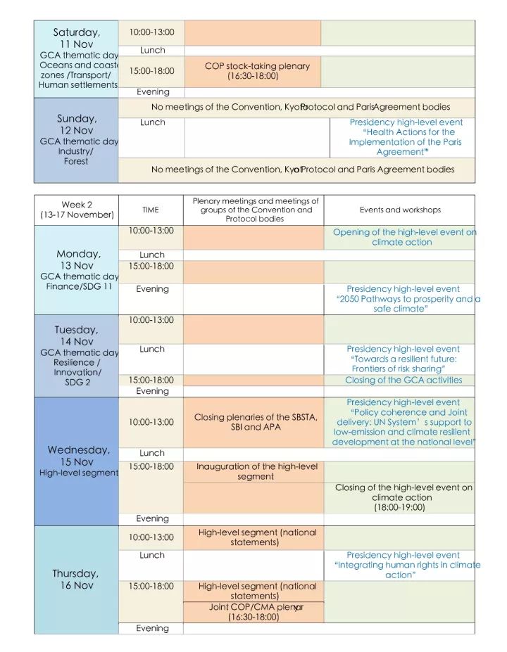 COP23和CMP13全體開(kāi)幕會(huì)議將于當(dāng)?shù)貢r(shí)間11月6日上午舉行;11日下午舉行COP第一周的盤(pán)點(diǎn)大會(huì),對(duì)一周的會(huì)議進(jìn)展及成果進(jìn)行總結(jié)回顧;16日下午將舉行COP,CMP的全體閉幕會(huì)議。