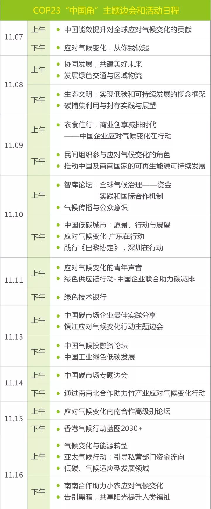 通過(guò)這些活動(dòng),將充分體現(xiàn)出中國(guó)政府、地區(qū)政府、社會(huì)各界、各行各業(yè)在節(jié)能減排、實(shí)現(xiàn)低碳綠色經(jīng)濟(jì)轉(zhuǎn)型、參與全球氣候治理上所作出的貢獻(xiàn)與成就,以及中國(guó)應(yīng)對(duì)氣候變化的堅(jiān)定決心與信心。更多波恩氣候大會(huì)和“中國(guó)角”前線資訊,請(qǐng)持續(xù)關(guān)注CCEEE微信公眾號(hào)。